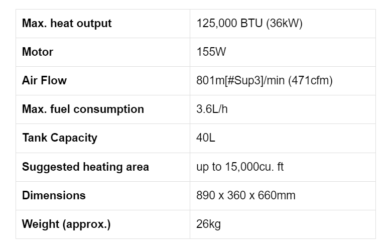 - Producing an impressive 125,000 Btu/hr, the 40ltr fuel tank gives approximately 11hrs continuous running time, making the unit extremely fuel efficient and economical.