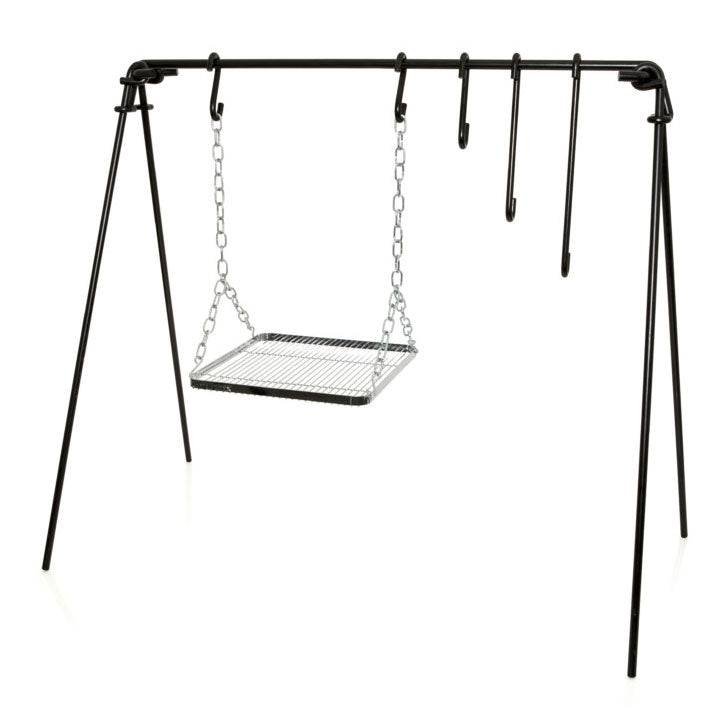 With a 45.3 in long crossbar, a grilling grate with height-adjustable chains as well as three hooks of different lengths to suspend cookware. The long crossbar provides for cooking over one or more fires.